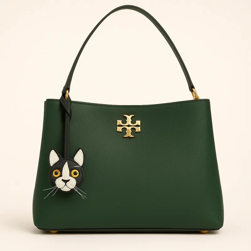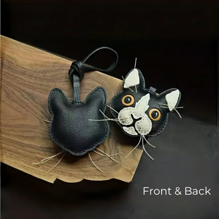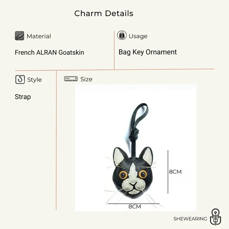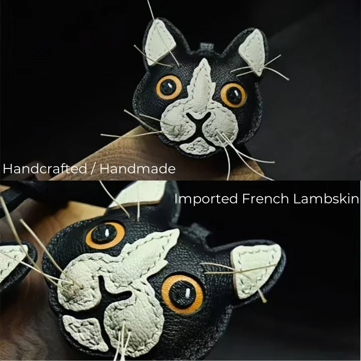 Celebrate your love for cats with the Black and White Cat Leather Bag Charm, a unique handmade accessory crafted from imported French lambskin. This piece captures the lively character of a cat with detailed stitching, textured leather, and natural whisker accents, bringing the face to life with striking realism. Measuring approximately 8 cm by 8 cm, it is compact yet eye-catching, making it an ideal decoration for handbags, backpacks, or use as a keychain. Each charm is stitched with the double saddle technique for durability and left with natural leather edges for an authentic touch. The wide-eyed design and playful contrast of black and white leather make it a standout piece that appeals to animal lovers and fashion enthusiasts alike. Perfect as a thoughtful gift or as a collectible accessory, this cat charm embodies the artistry of slow fashion, turning everyday essentials into conversation-starting treasures.