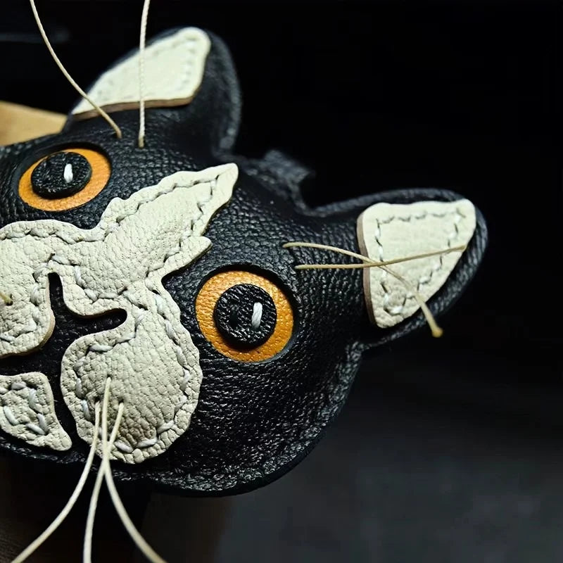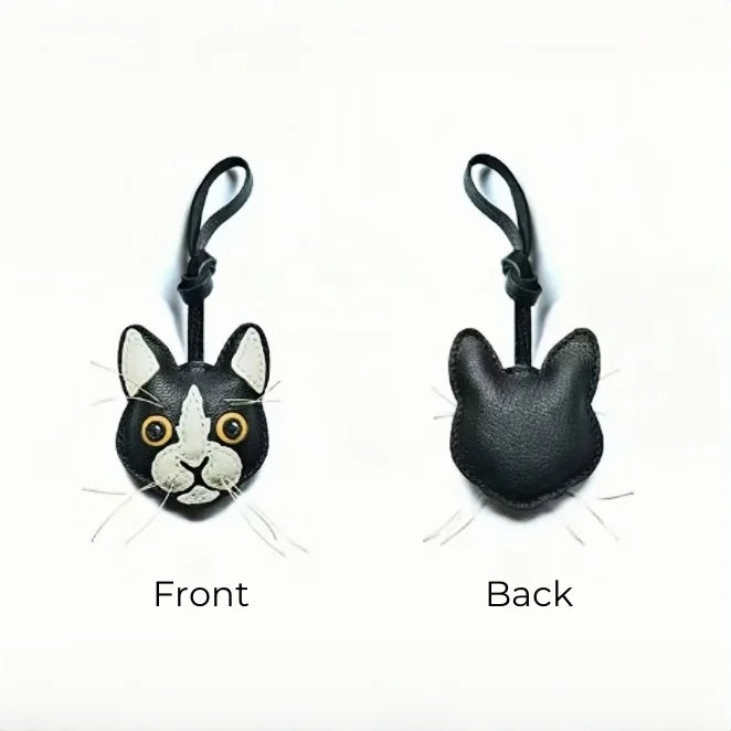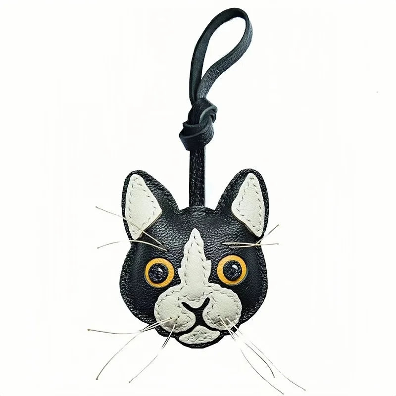 Black and White Cat Leather Bag Charm – Handmade Lambskin Pendant | Cute Cat Face Keychain | Whisker-Inspired Accessory & Gift for Women