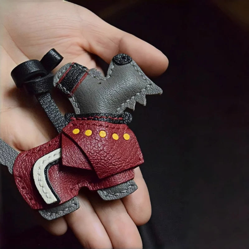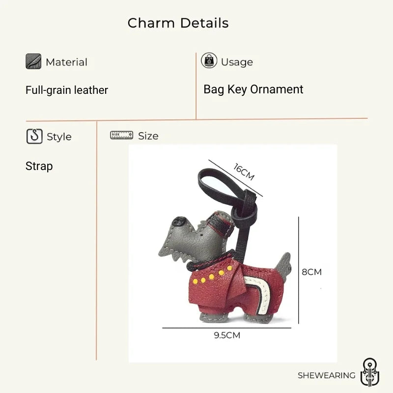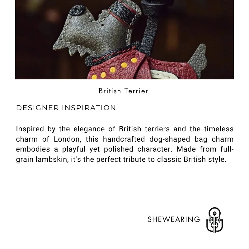 This handcrafted leather bag charm is shaped like a dapper British terrier, exuding vintage charm and elegance. Made with full-grain French imported lambskin, the piece features detailed saddle stitching and hand-cut panels, echoing the style of traditional London guards. The adorable silhouette, rich texture, and deep red-and-gray color palette make it a standout accessory on any handbag or key set. Measuring approximately 9.5cm × 8cm, it's a pocket-sized luxury full of character and craftsmanship. Ideal as a gift for dog lovers or anyone who appreciates artisanal design with a playful twist.