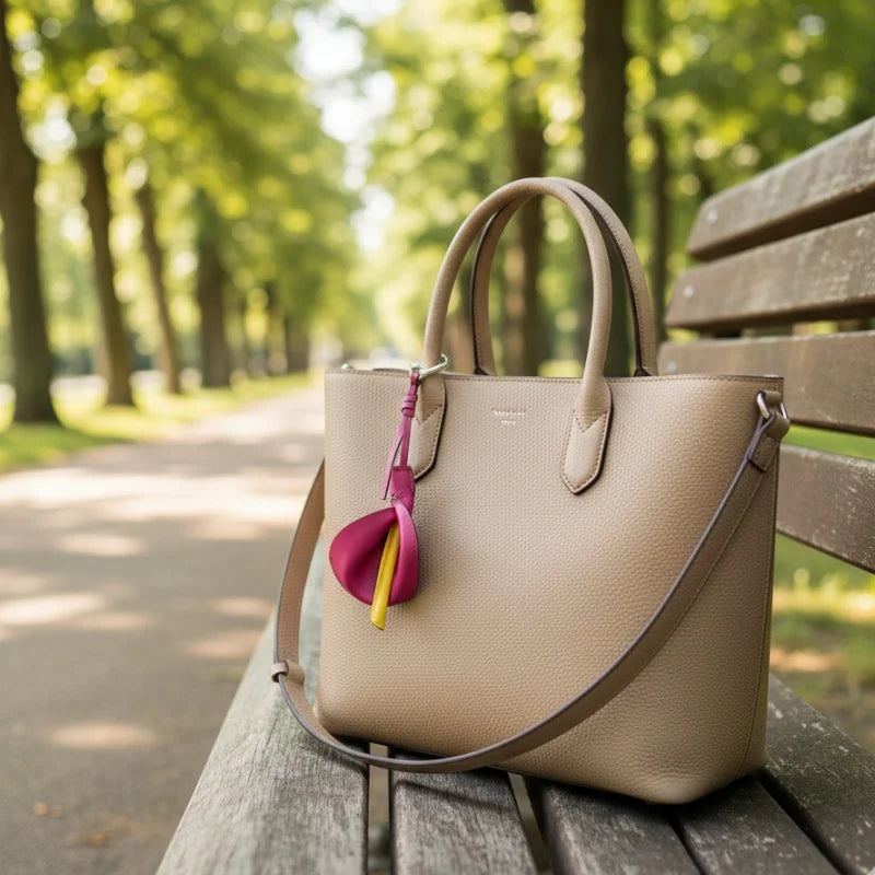 This versatile charm can be used as a bag accessory, a keychain, or a thoughtful gift. Its lightweight yet durable design ensures it adds style without bulk, while the secure metal clasp makes it easy to attach to handbags, totes, or keys. Available in multiple colors, the charm complements a variety of styles, from classic to contemporary, adding a refined touch to everyday ensembles.
