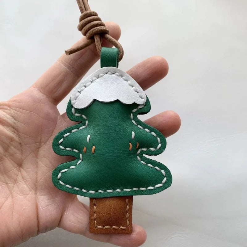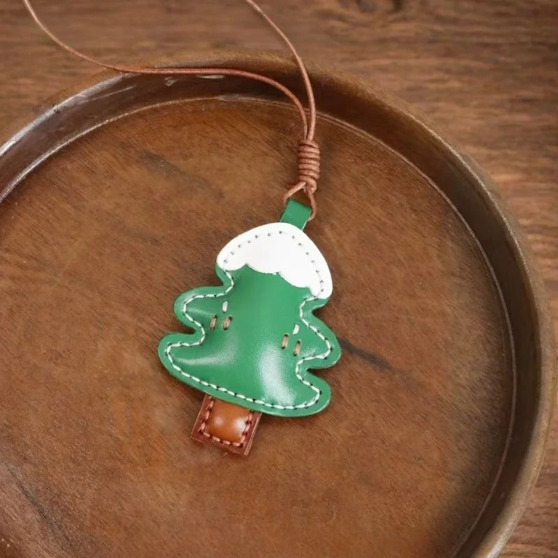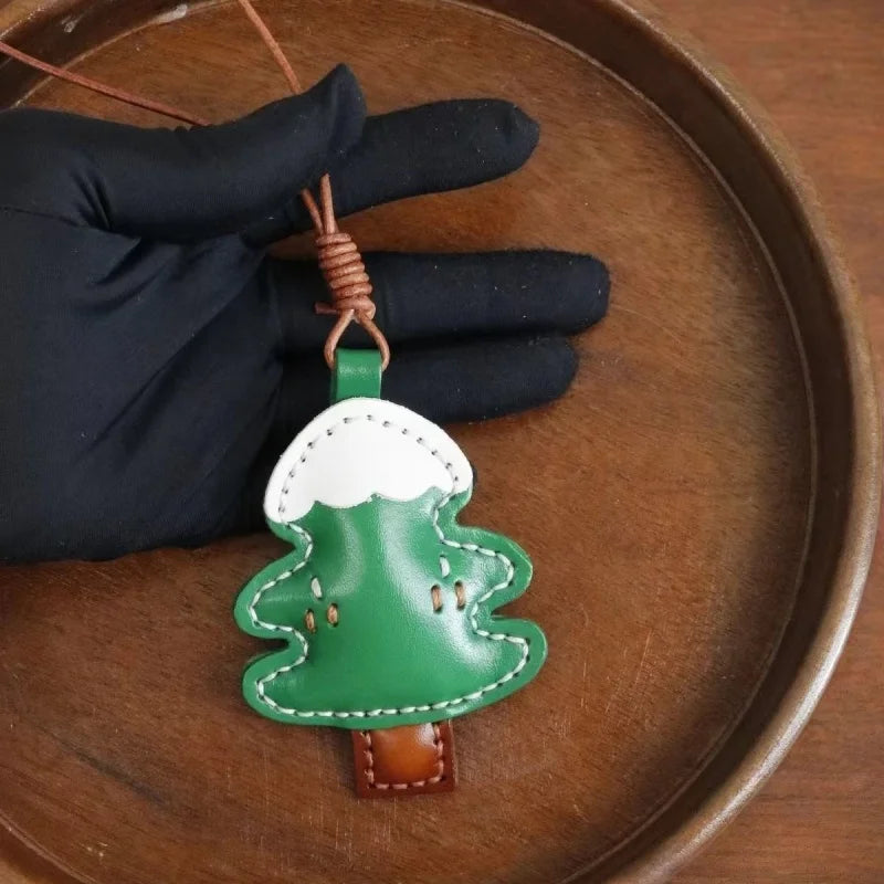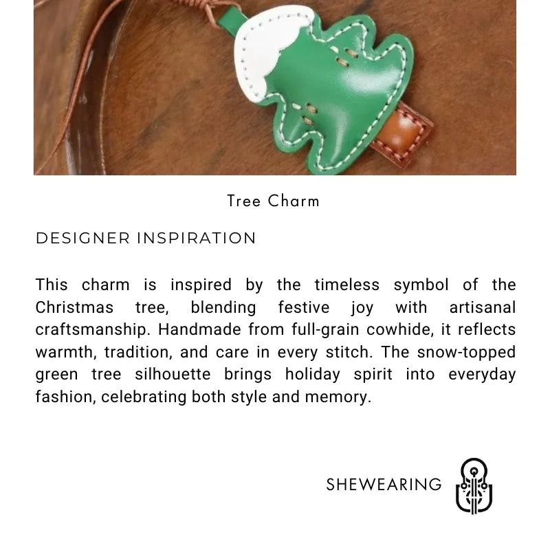 Celebrate the holiday spirit all year round with this exquisite Christmas Tree Leather Bag Charm. Crafted from premium full-grain cowhide, the charm offers a supple, durable texture that only improves with time. The design features a lush green tree topped with snow, paired with a natural leather trunk and highlighted by meticulous hand-stitching. Its vintage aesthetic makes it a unique accessory for handbags, totes, or even as a keychain. Measuring approximately 6.2 cm in width with a 26 cm hanging strap, it is the perfect size to add charm without overwhelming your bag. This piece captures both craftsmanship and festive character, making it an ideal seasonal gift or a timeless collectible. Whether worn in winter or kept as a year-round symbol of warmth and joy, the Christmas Tree Bag Charm brings a touch of nostalgia and artisanal elegance to your everyday style.