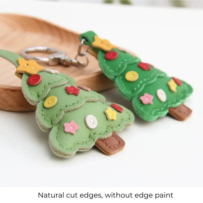 Bring the festive spirit to your style with this handcrafted Christmas Tree Leather Bag Charm, made from luxurious top-grain sheepskin. Designed with meticulous detail, the charm features vibrant leather ornaments, a golden star, and layered stitching that captures the joy of the season. Each piece is carefully hand-cut and double saddle-stitched, ensuring durability while highlighting the artistry of traditional leathercraft.