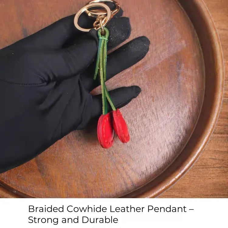 The braided leather stems and sturdy gold-tone hardware ensure durability and ease of use—perfect for attaching to handbags, backpacks, or keys. Its compact size (9cm height, 3.3cm width) makes it a subtle yet statement-making detail that fits effortlessly into everyday life. The rich red hue contrasts beautifully with the earthy green stem, evoking warmth, playfulness, and quiet luxury.