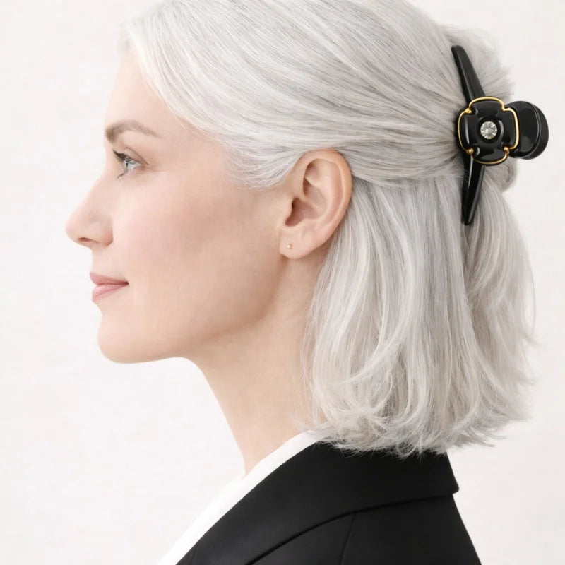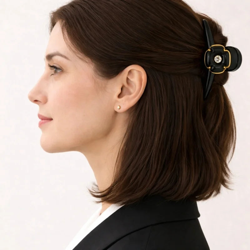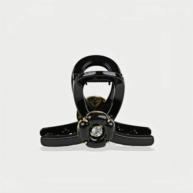 Elegant Black Camellia Crystal Hair Claw Clip – French Vintage Style Acetate Hair Accessory | Strong Hold Large Claw Clip with Gold Detail | Refined Everyday Styling Gift for Her