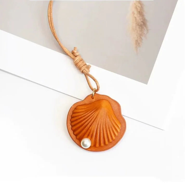Elegant Scallop Shell Full-Grain Leather Bag Charm | Double-Sided Vintage-Style Purse Accessory with Faux Pearl Accent | Luxurious Collectible Key Fob