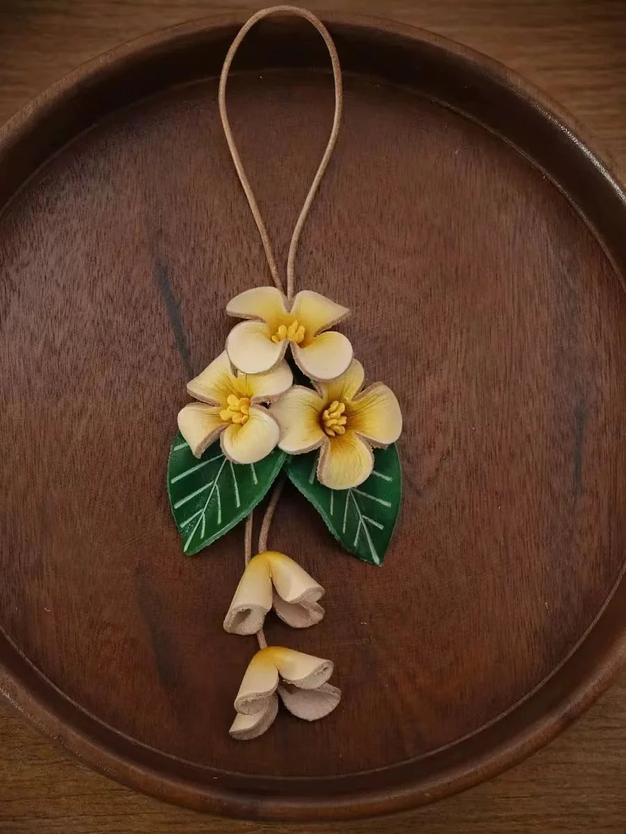 This Golden Osmanthus Leather Bag Charm is a refined piece that highlights the beauty of seasonal florals through artisanal craftsmanship. Handmade from full-grain cowhide, it features a cluster of vibrant golden osmanthus blossoms paired with delicately carved leaves, each petal carefully cut and assembled for a lifelike three-dimensional effect. The warm golden-yellow tones are accented with hand-painted leaf patterns, echoing the charm of autumn foliage. Measuring approximately 11.4 cm in length and 3.1 cm in width, it is the perfect accessory for handbags, totes, or even as a unique keychain. The durable leather strap ensures secure attachment while enhancing the charm’s natural aesthetic. Both decorative and symbolic, this charm conveys wishes of happiness and prosperity, making it an ideal gift for women who appreciate handmade artistry and seasonal elegance.