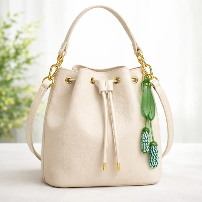 The vibrant yet balanced color pairings—soft coral with cream, or mint with cool teal—bring freshness without overpowering your handbag. Paired with elegant green leather leaves and suspended from a sturdy brass ring or leather loop, the design feels both artisanal and sophisticated.