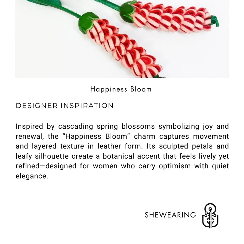 Delicately handcrafted from premium full-grain cowhide, the “Happiness Bloom” bag charm transforms leather into a dimensional floral cascade. Each petal-like segment is individually cut and layered to create a sculptural tassel effect, echoing the graceful fall of spring blossoms in motion.
