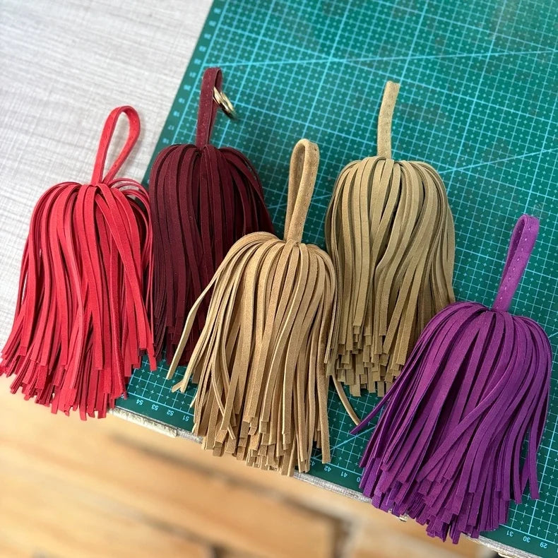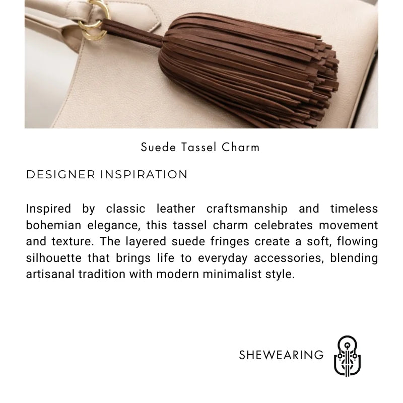 Each charm is carefully handmade using genuine suede leather, cut into dozens of fine, flowing strips that create a rich and luxurious tassel effect. The soft texture and layered structure allow the tassel to move naturally as you walk, giving your bag a sense of motion and relaxed sophistication.