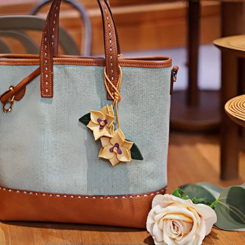 Handcrafted Waxed Leather Double Flower Bag Charm – Vintage-Inspired Floral Pendant with Layered Petals | Artisan Cowhide Handbag Accessory | Elegant Gift for Her