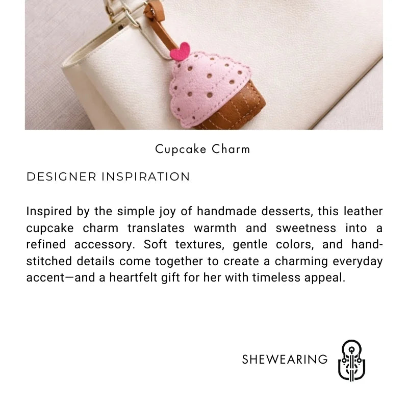 Delicately handcrafted from genuine leather, this cupcake-shaped bag charm brings a touch of playful elegance to everyday style. Designed with soft pastel tones and subtle stitching details, it captures the charm of a miniature dessert while maintaining a refined, quiet-luxury aesthetic. Each piece is carefully hand-cut and hand-stitched, showcasing natural leather textures and thoughtful craftsmanship.