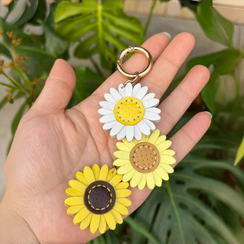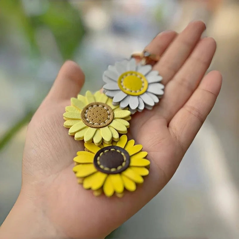 The Handmade Leather Daisy Sunflower Bag Charm captures the cheerful spirit of blooming fields in a refined accessory for everyday style. Featuring three handcrafted flowers in white, yellow, and golden brown, each petal is precisely cut from premium leather and secured with detailed stitching that enhances both durability and beauty. The charm is anchored by a polished gold-tone ring and chain, allowing it to be used seamlessly as a handbag pendant or as a keychain. Its vibrant yet natural palette makes it versatile enough to complement canvas totes, luxury handbags, or minimalist satchels, adding a refreshing pop of color and artisanal detail. Lightweight yet durable, this charm embodies both elegance and playfulness. Whether given as a thoughtful gift or chosen as a personal keepsake, it offers a delicate floral accent that brightens every occasion while showcasing craftsmanship that is built to last.