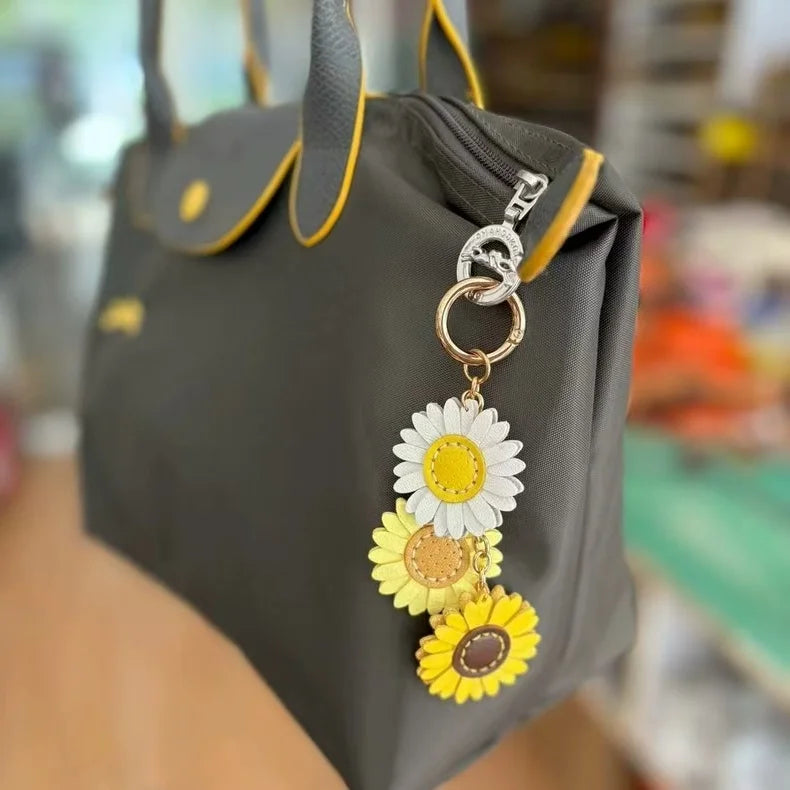 Handmade Leather Daisy Sunflower Bag Charm – Triple Floral Keychain & Handbag Pendant | White, Yellow & Brown Leather Flowers | Elegant Women’s Gift Accessory