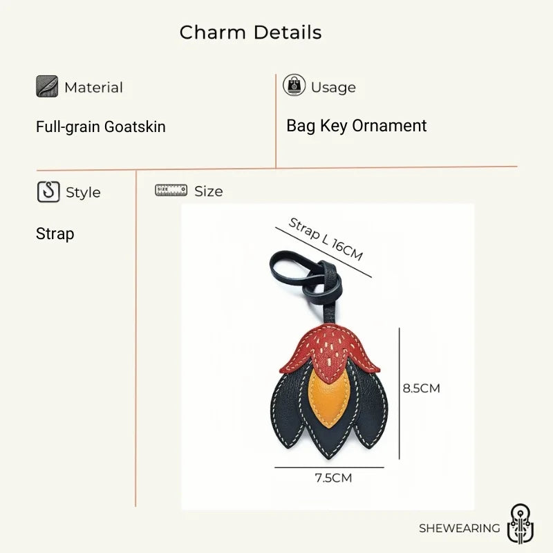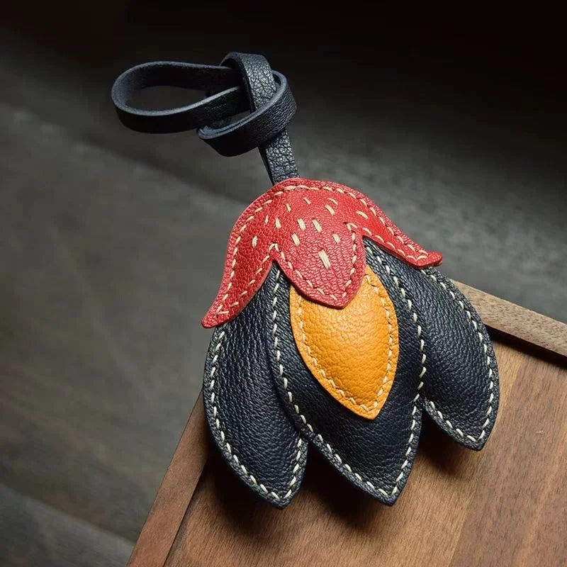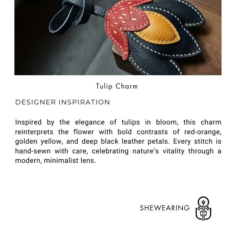 The Handmade Leather Tulip Bag Charm is a striking accessory designed to blend simplicity with individuality. Crafted from premium full-grain leather, it features layered petals in contrasting tones: a vivid red-orange upper petal, golden yellow inner accent, and deep black leather base. Each element is meticulously cut and saddle-stitched by hand with durable double-needle technique, ensuring strength and artisanal precision. Measuring approximately 8.5 cm by 7.5 cm with a 16 cm strap, it hangs elegantly from tote handles, satchels, or minimalist handbags without overwhelming the silhouette. The natural leather cut edges and visible stitching highlight its raw authenticity, while the padded texture adds dimension and durability. This versatile charm also doubles as a keychain, making it a functional yet stylish piece. Perfect for gifting or adding a touch of artistic flair to your personal collection, the tulip charm captures a timeless balance between creativity, craftsmanship, and modern sophistication.