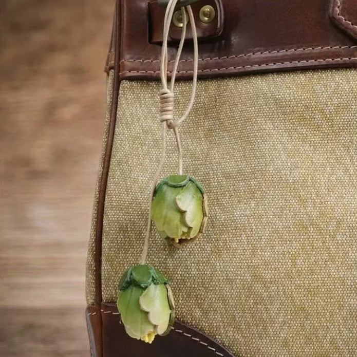 Handmade Tulip Bud Leather Bag Charm – Full-Grain Cowhide Pendant | Artisan Floral Keychain | Unique Leather Handbag Decoration