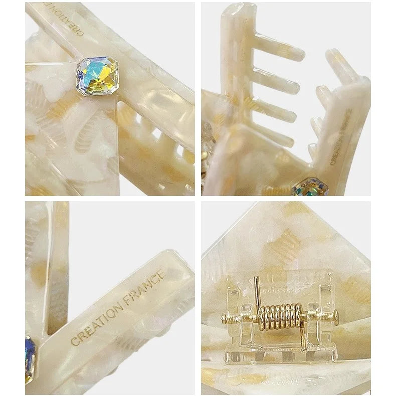 Ivory Marble Acetate Hair Claw Clip – Elegant Geometric French-Inspired Hair Accessory | Handmade Textured Square Design with Crystal Accent | Chic Minimal Hair Clip Gift for Her
