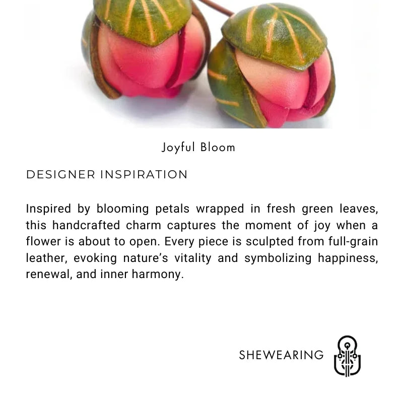 Crafted with precision and soul, the Joyful Bloom Leather Bag Charm is a celebration of nature’s quiet beauty. Designed to resemble a blossoming flower nestled within lush leaves, this unique piece is hand-molded from full-grain cowhide leather and dyed in layers of pink, green, and blush. The organic color gradients and dimensional sculpting create a life-like floral effect that’s both eye-catching and meaningful.
