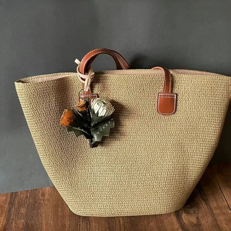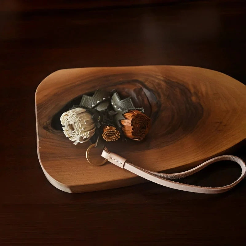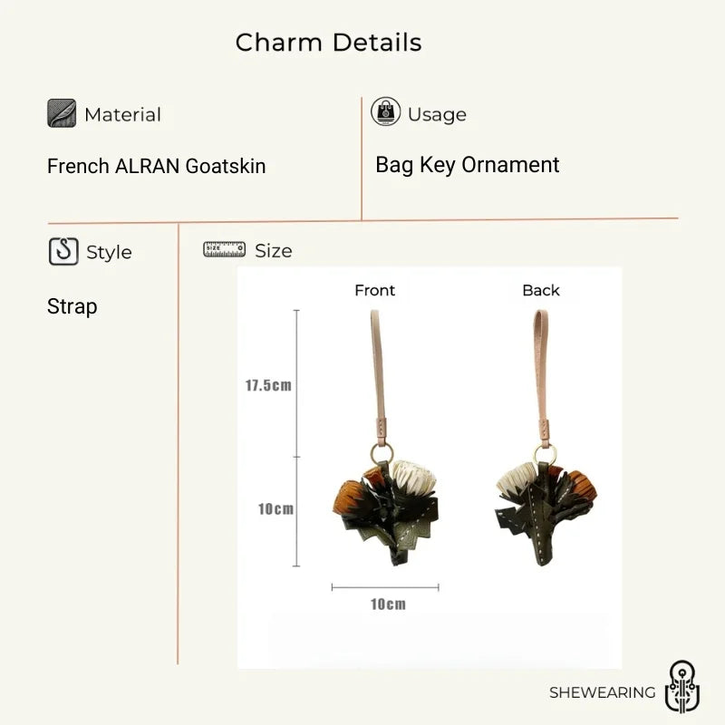 The natural texture of vegetable-tanned leather develops character with time, making each charm a personal piece that evolves with its owner. Its versatile strap allows easy attachment to handbags, totes, or keys, while the bouquet-style composition adds depth and a refined artistic touch.