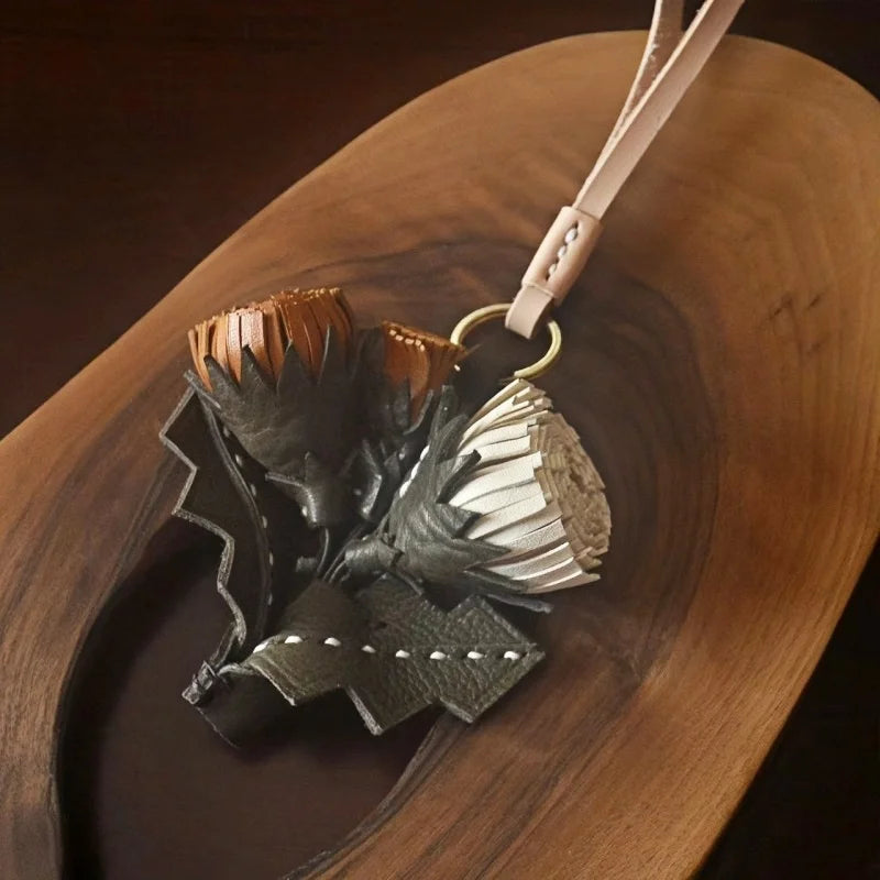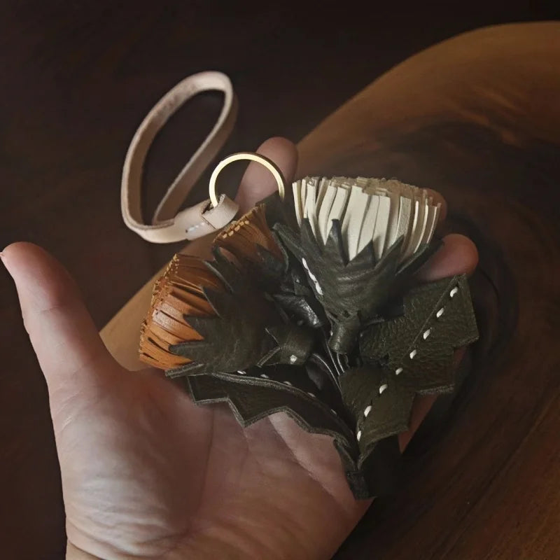 Leather Dandelion Flower Bag Charm – Handmade Vegetable-Tanned Cowhide Pendant | Minimalist Floral Keychain | Elegant Handbag Accessory