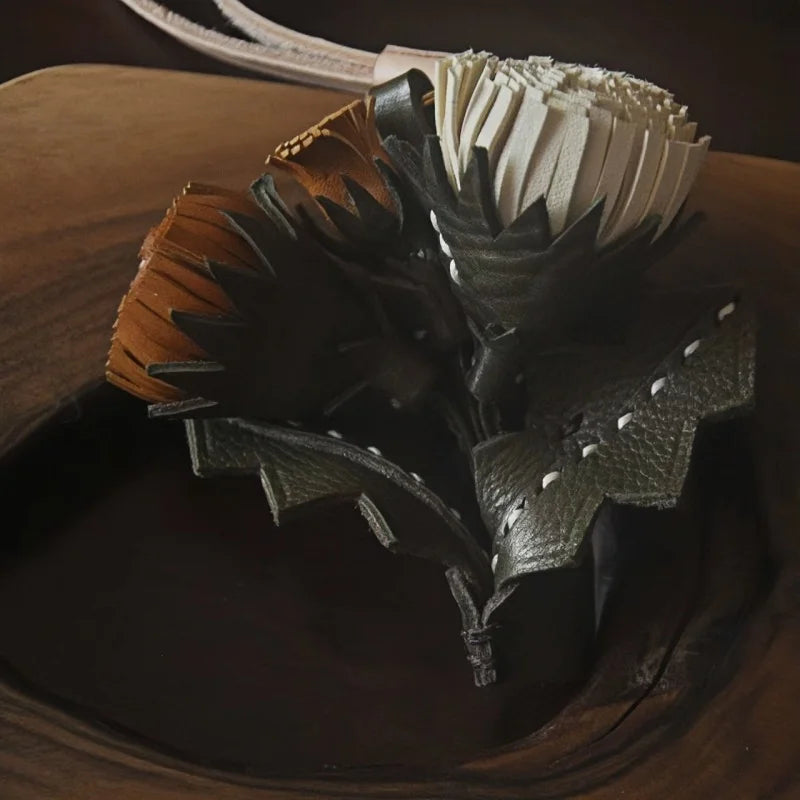 Celebrate elegance and individuality with this Leather Dandelion Flower Bag Charm, a unique accessory crafted from premium vegetable-tanned cowhide. Each charm is entirely handmade, showcasing the meticulous artistry of leather cutting, shaping, and stitching. The three-dimensional floral design draws inspiration from dandelions, capturing both their delicate beauty and symbolic meaning of freedom and grace.