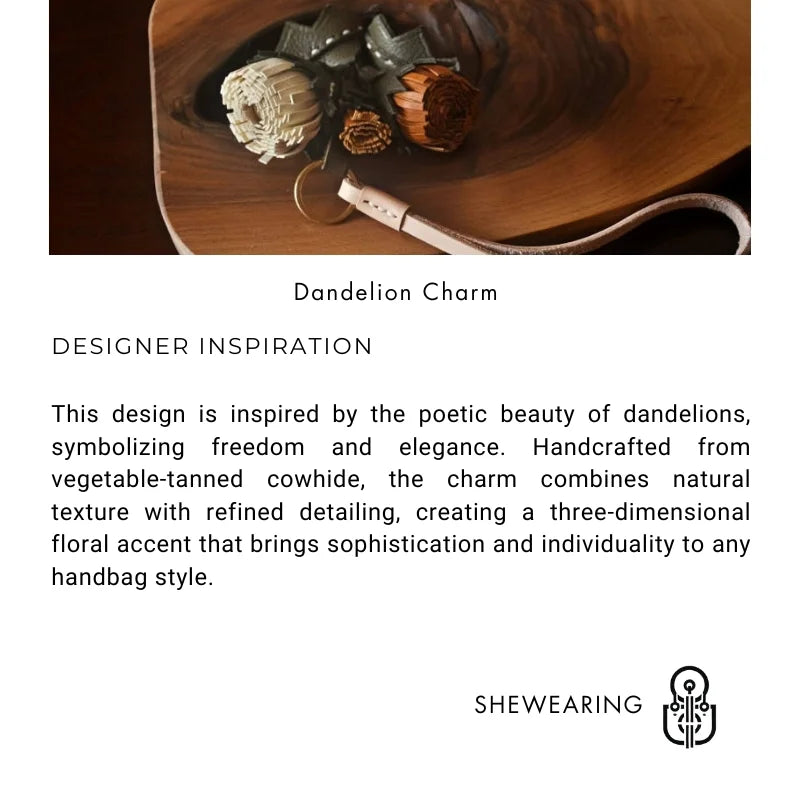 This charm is not only a beautiful accessory but also a statement of craftsmanship and slow living, designed for women who appreciate authenticity and timeless elegance. Whether paired with a classic black handbag or a casual woven tote, the dandelion charm enhances every style with warmth, creativity, and luxury.