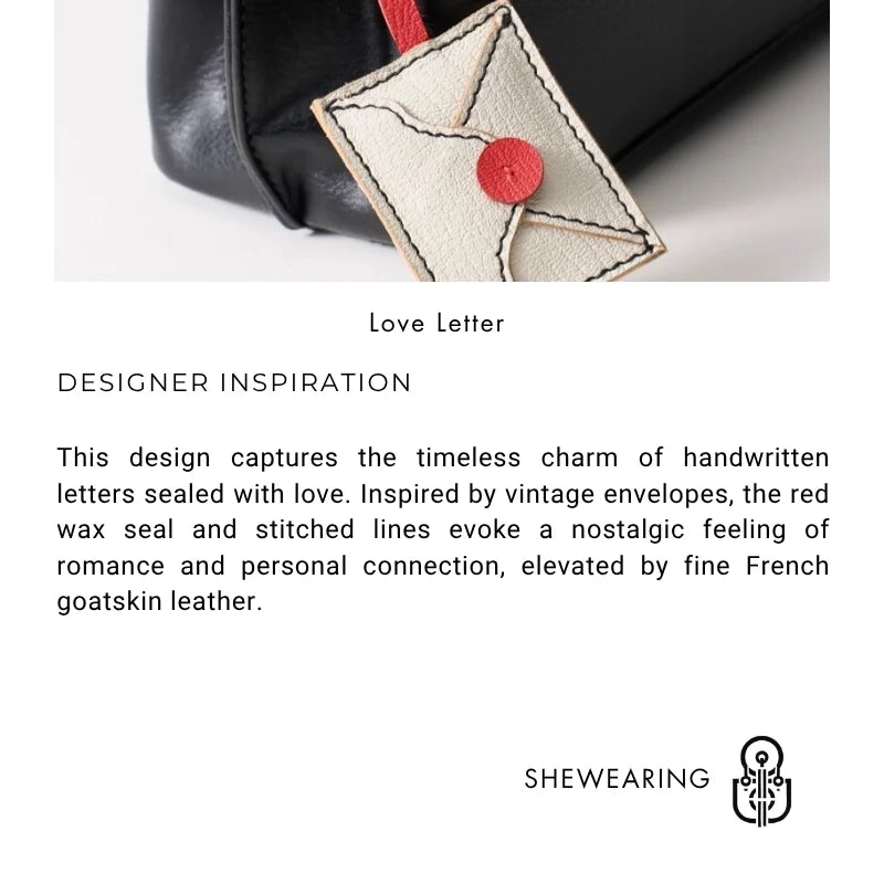 This charming Love Letter bag charm reimagines the elegance of vintage stationery into a wearable leather accessory. Made from supple French goatskin, the envelope silhouette features a bold red seal and delicately stitched border, emulating the beauty of a handwritten note. Every detail, from the curved flap to the wax-seal button, is handcrafted to bring a sense of intimacy and nostalgia. The design is lightweight yet durable, ideal for decorating handbags, totes, or backpacks with a touch of romance. The red leather strap adds a subtle pop of color, enhancing the minimalist yet eye-catching appeal. A perfect gift for women who appreciate sentimental design, fine leather, and everyday elegance.