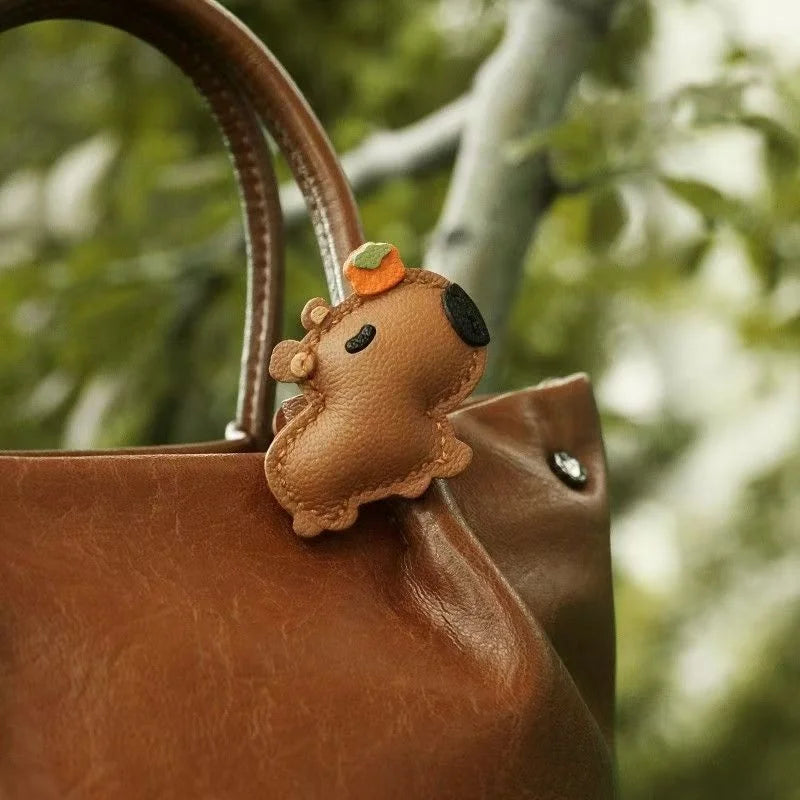 Lucky Capybara Leather Bag Charm – Handmade Sheepskin Capybara with Persimmon Hat | Adjustable Clip-On Pendant | Whimsical Good Luck Gift