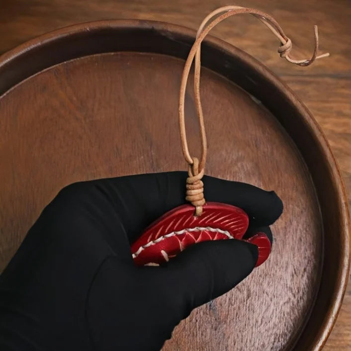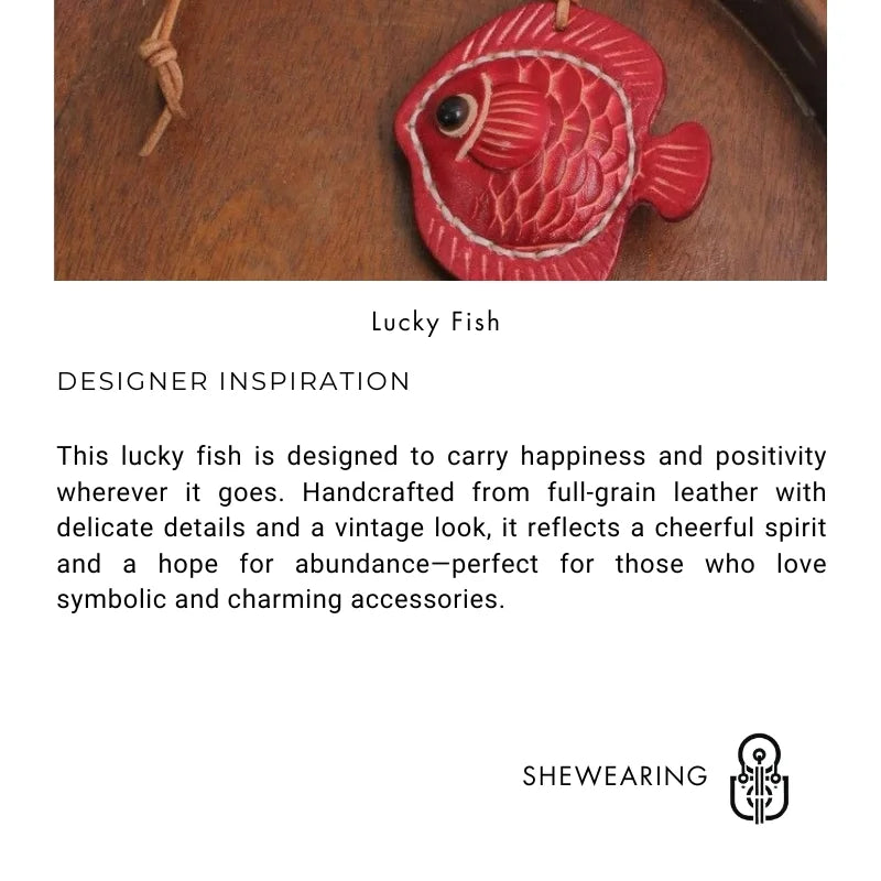 Its retro aesthetic and soft curves make it suitable for bags, keys, or cars, while the natural leather cord allows adjustable styling. The charm is fully handmade with hand-dyed leather and fine stitching, ensuring uniqueness in every piece. Whether as a personal statement or a heartfelt gift, this fish brings a lighthearted charm to your everyday life.
