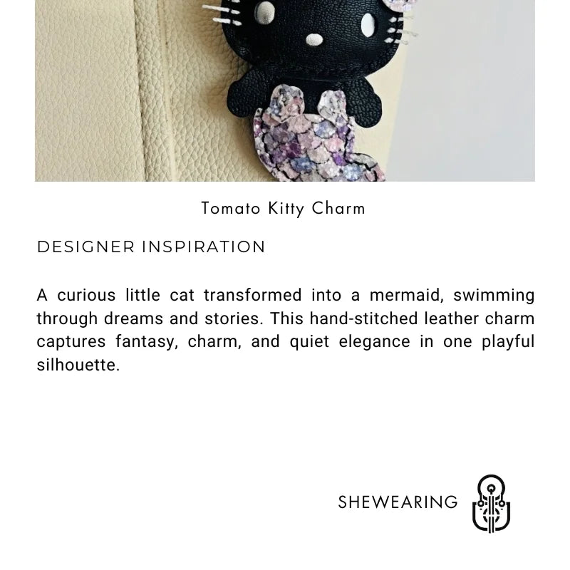 This handcrafted leather charm tells the story of a curious little cat who dreams beyond the shore. Transformed into a mermaid, she swims through fantasy, whimsy, and wonder. Crafted with soft leather and detailed stitching, the charm blends imaginative storytelling with quiet elegance. Whether you choose a sparkly tail or a silvery sheen, this playful piece adds a dreamy touch to your bag, backpack, or keys. It’s a thoughtful gift for anyone who loves cats, mermaids, or charming little surprises.