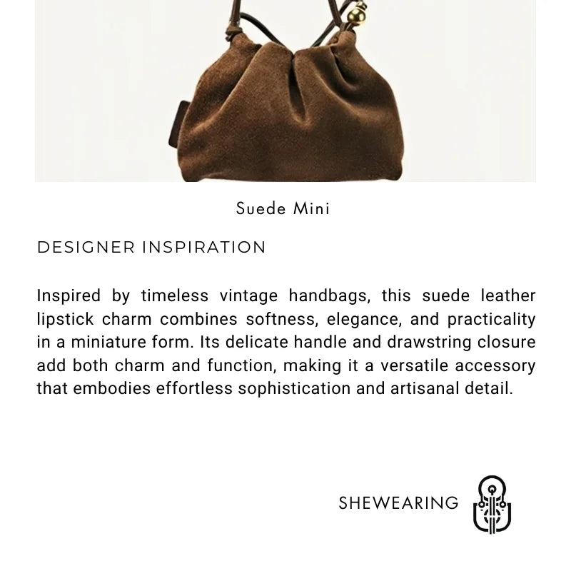 Handcrafted from premium suede leather, the Mini Suede Leather Lipstick Charm is designed for those who appreciate refined details in everyday life. Compact yet versatile, this accessory measures just the right size to store lipstick, earbuds, coins, or small keepsakes. Its structured silhouette, paired with a soft suede texture, reflects understated elegance and a nod to vintage-inspired fashion. The top handle and drawstring closure not only ensure convenience and security but also add a touch of playful sophistication. Whether clipped to a handbag, carried as a miniature accessory, or used as a stylish storage solution, it seamlessly blends practicality with timeless design. Available in multiple colors, including classic brown, sleek black, and denim blue, it adapts effortlessly to different styles and occasions. Perfect as a personal treat or a thoughtful gift, this suede charm elevates simple storage into a statement of high-quality craftsmanship and chic versatility.