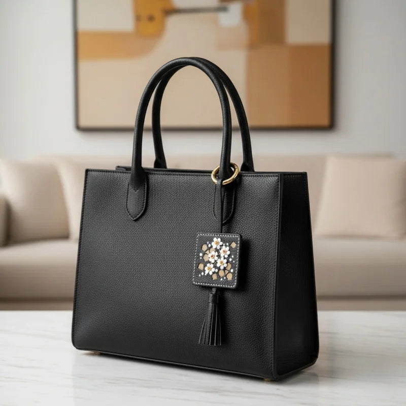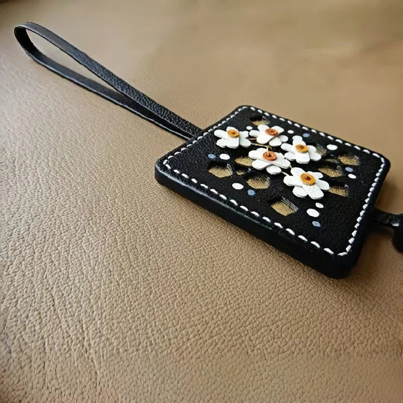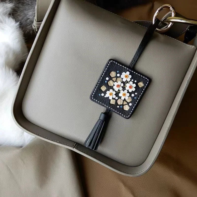 The central design showcases a meticulously hand-stitched floral arrangement, set within a sophisticated square frame with complementary golden accents. A delicate, matching leather tassel adds movement and sophistication. The reverse side is finished with the same impeccable quality. This charm is a subtle yet powerful statement piece, reflecting the wearer’s appreciation for original design, exclusive materials, and enduring, detailed craftsmanship. It's presented in premium packaging, making it an ideal, memorable birthday or holiday gift.