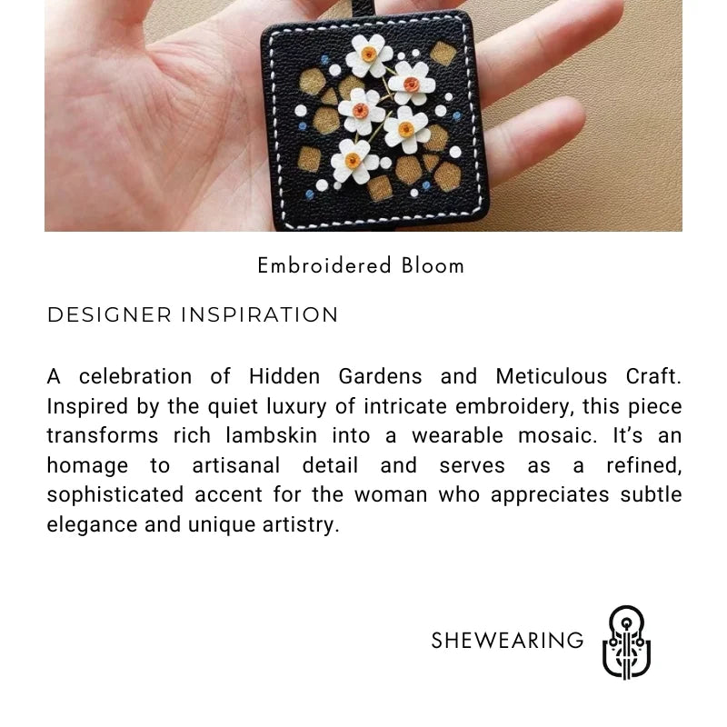 Introduce a touch of refined artistry to your everyday carry with The Embroidered Bloom Charm. This piece is the epitome of Quiet Luxury, crafted from the softest, most supple French Lambskin Leather, chosen for its smooth texture and rich depth of color.