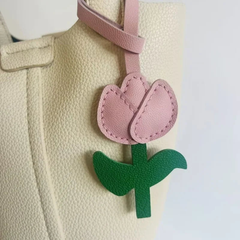 Pastel Tulip Leather Bag Charm – Handmade Full-Grain Leather Pendant | Sweet Minimalist Flower Keychain | Elegant Gift for Women