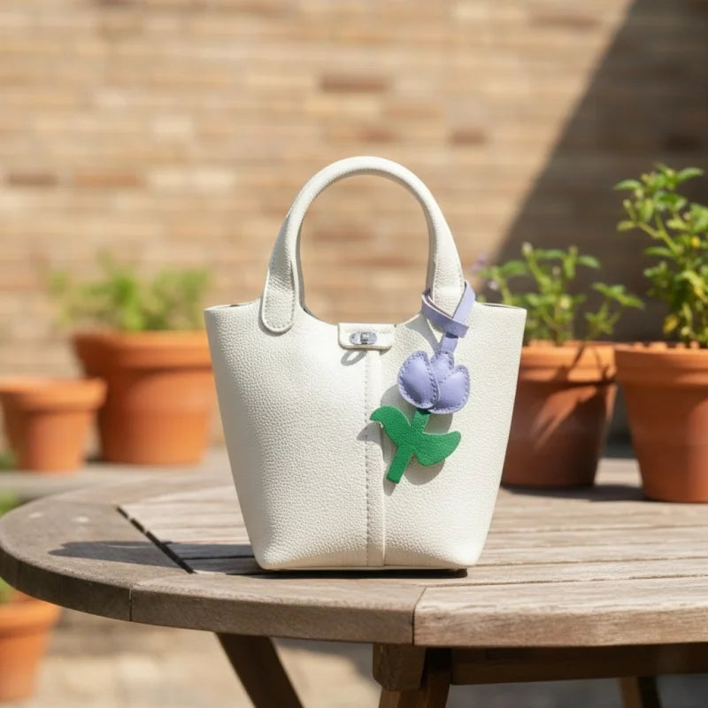 The Pastel Tulip Leather Bag Charm captures the essence of spring through color and craftsmanship. Each charm is handmade from full-grain leather with gentle hues of lilac, pink, or yellow — each petal hand-stitched to form a three-dimensional bloom.
