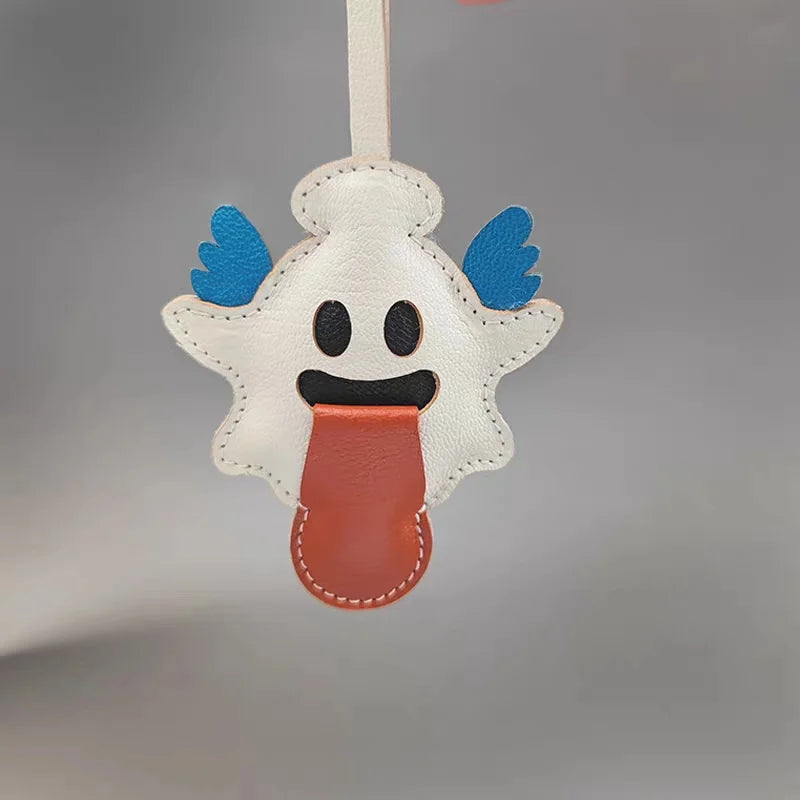 Playful Ghost Leather Bag Charm – Handmade French Lambskin Pendant with Blue Wings | Whimsical Backpack Accessory | Cute Halloween-Inspired Luxury Keychain