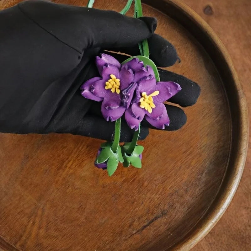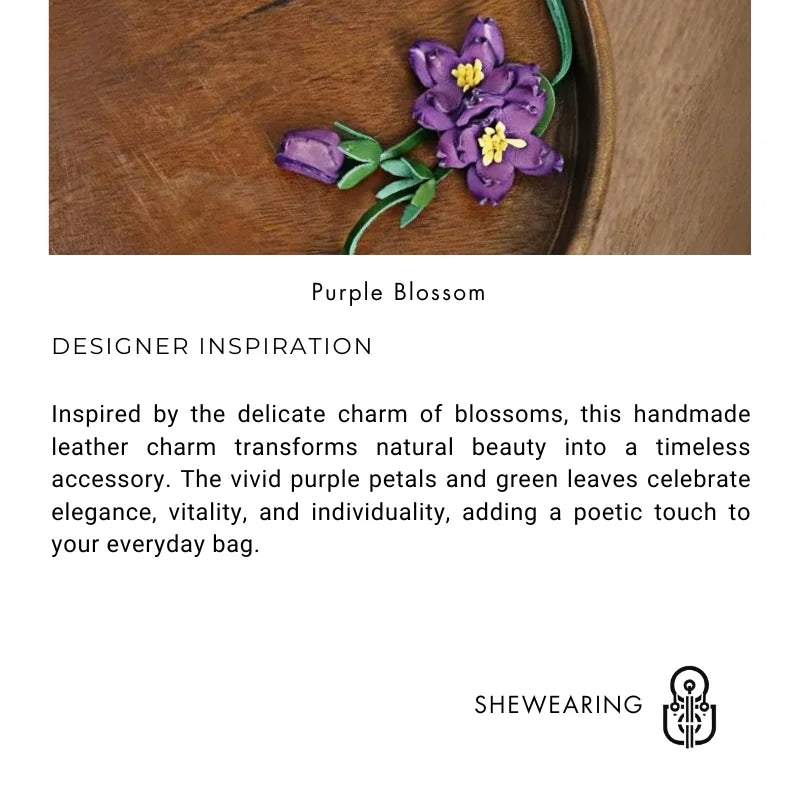 This Purple Blossom Leather Bag Charm is a handcrafted piece that embodies the perfect balance between artistry and functionality. Made from premium full-grain leather, each petal and leaf is carefully cut, shaped, and stitched by hand, bringing the charm of blooming flowers into your accessories. The vibrant purple petals are contrasted with fresh green stems and highlighted with yellow stamens, making the flower appear lively and dimensional.