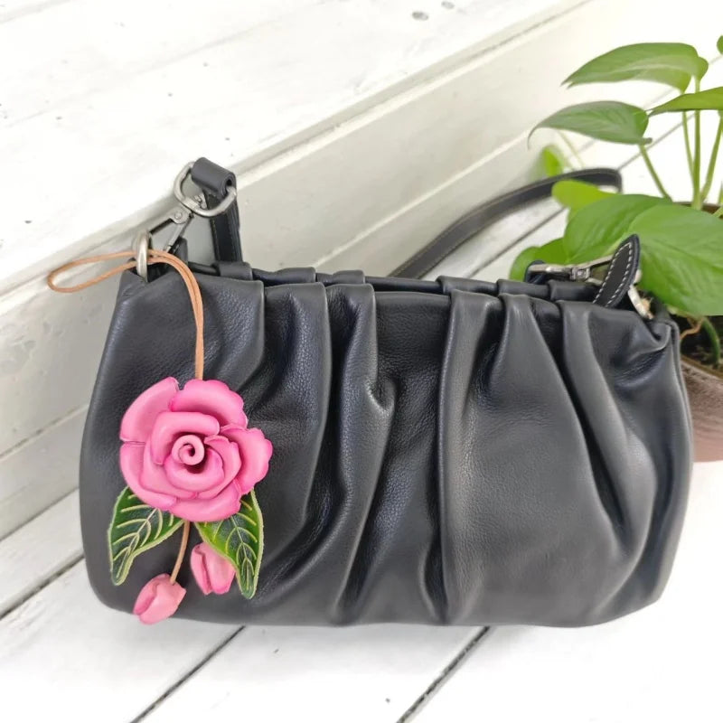 Romantic Rose Leather Bag Charm – Handmade Full-Grain Leather Flower Pendant | Artisan Floral Keychain for Couples & Friends | Elegant Ins-Style Gift Accessory