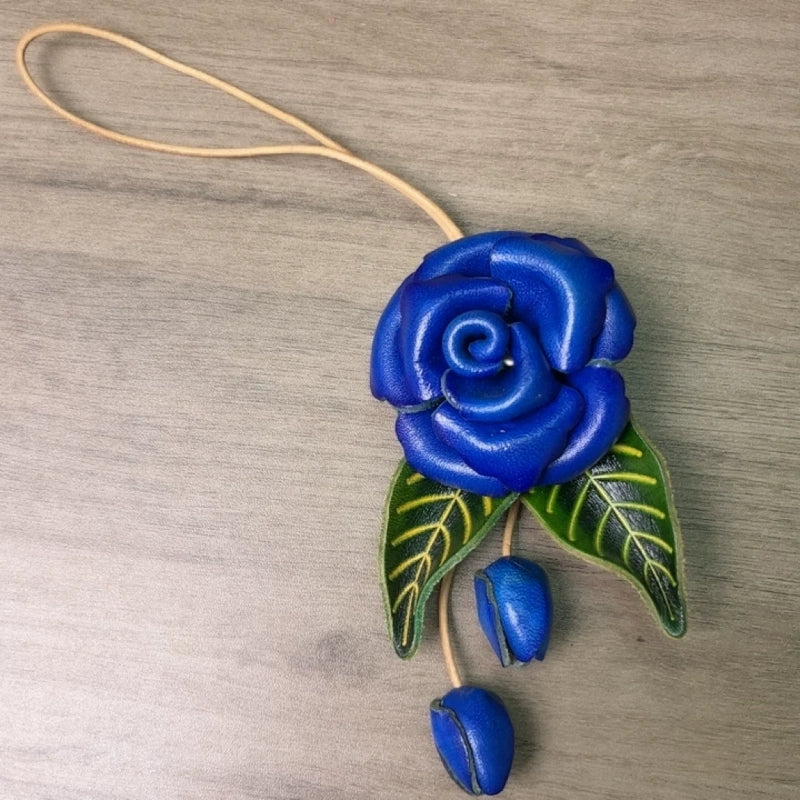 Crafted from premium full-grain leather, this handmade rose bag charm brings elegance and charm to any handbag or backpack. The delicate rose bloom, paired with two rosebuds and detailed green leaves, is sculpted and dyed entirely by hand, creating a natural and realistic floral accessory. The soft yet durable leather ensures a luxurious texture, while the adjustable loop allows for versatile use on various bag styles. Available in multiple colors, this charm is ideal as a gift between close friends or couples, symbolizing affection, beauty, and care. Whether for daily wear or special occasions, this rose charm adds a romantic touch to your style with refined craftsmanship.