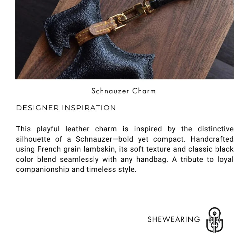 Crafted with precision and passion, this Schnauzer-inspired leather bag charm brings a refined sense of personality to your accessories. Made from premium French imported lambskin, the texture is naturally grainy, soft, and durable. The silhouette echoes the charm of the Schnauzer breed—defined yet minimalist, with hand-stitched accents and a soft three-dimensional form. Finished with a secure gold-tone clasp and leather wrist strap, this charm can be used as a keychain, handbag pendant, or even a thoughtful gift for dog lovers. The neutral black color makes it versatile and understated, pairing effortlessly with modern, classic, or vintage bags. Whether you're accessorizing your daily tote or gifting a stylish friend, this small charm adds a unique story and elevated detail to any ensemble.