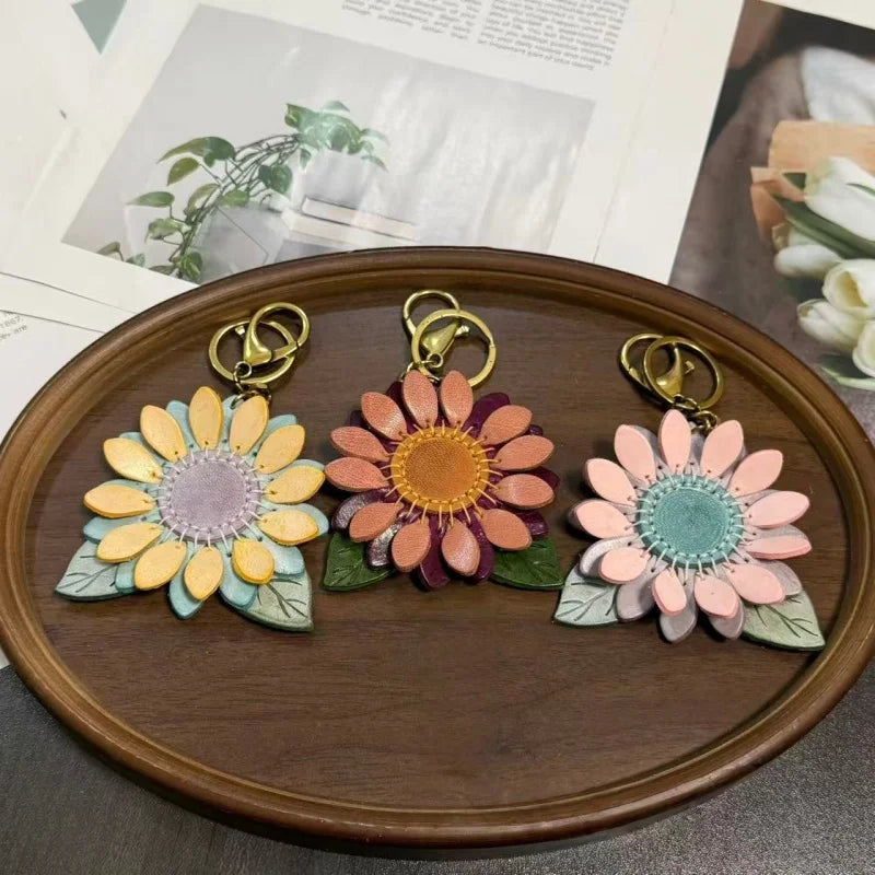 This sunflower leather bag charm is thoughtfully handcrafted from premium full-grain leather with a soft waxed finish, offering both tactile warmth and lasting durability. Designed with layered petals and delicate hand stitching, it captures the natural elegance of a sunflower in a calm, understated form—perfect for women who appreciate refined details rather than bold statements.