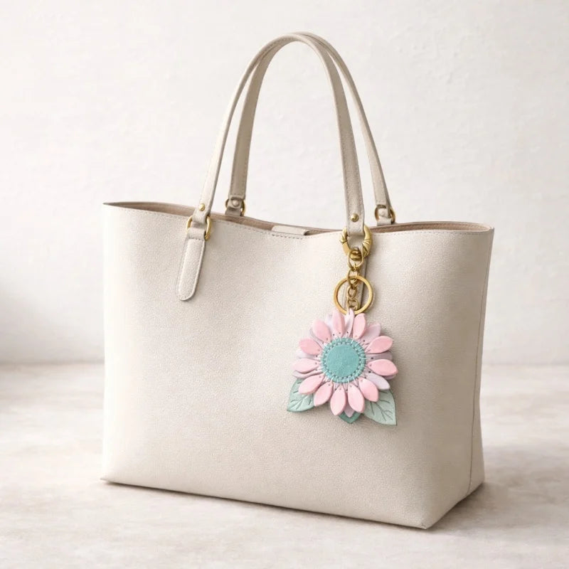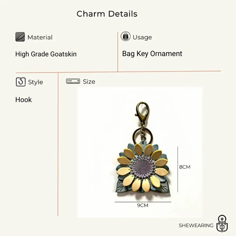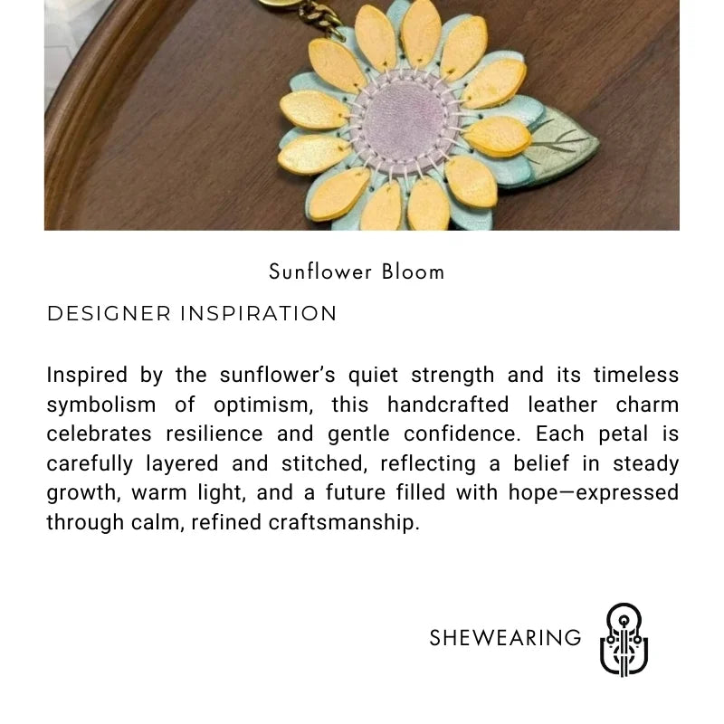 The sunflower has long symbolized optimism, inner strength, and a future full of promise. This piece transforms that meaning into a wearable accent, adding a gentle emotional touch to handbags, totes, or everyday essentials. Its balanced proportions and muted tones allow it to complement both light and dark leather bags without overwhelming the overall look.
