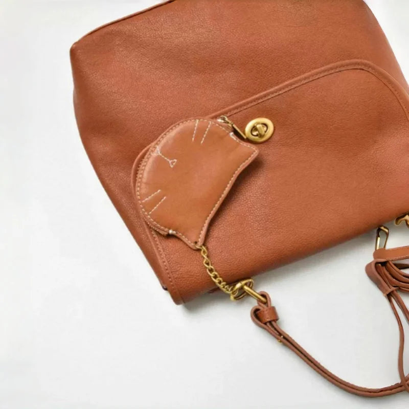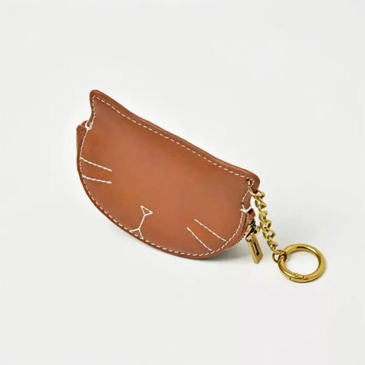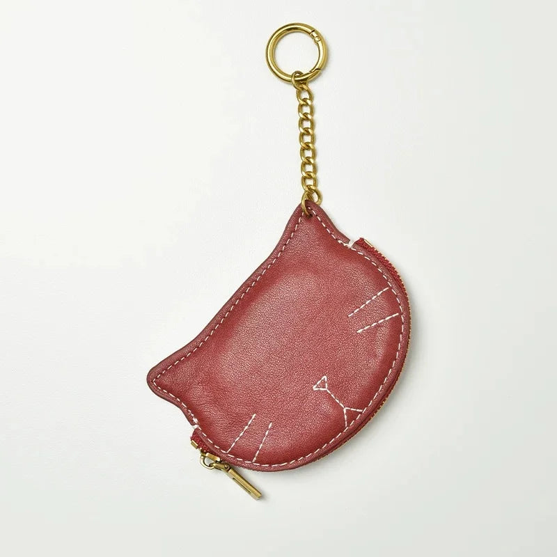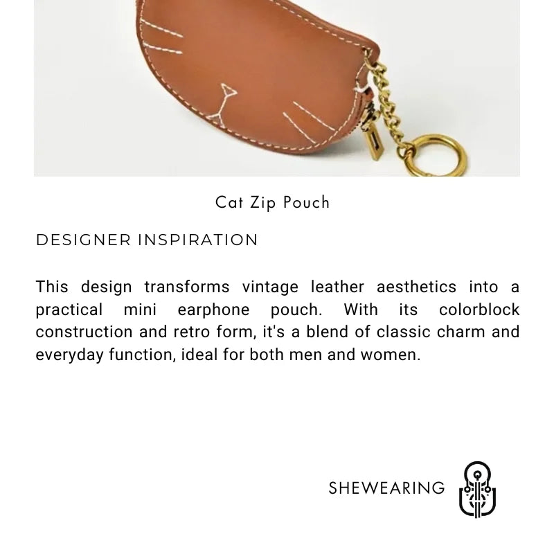 Vintage Cat-Shaped Leather Pouch Charm – Full-Grain Cowhide Zipper Coin Purse for Women | Key, Earphone & Lipstick Organizer | Retro Small Bag Accessory