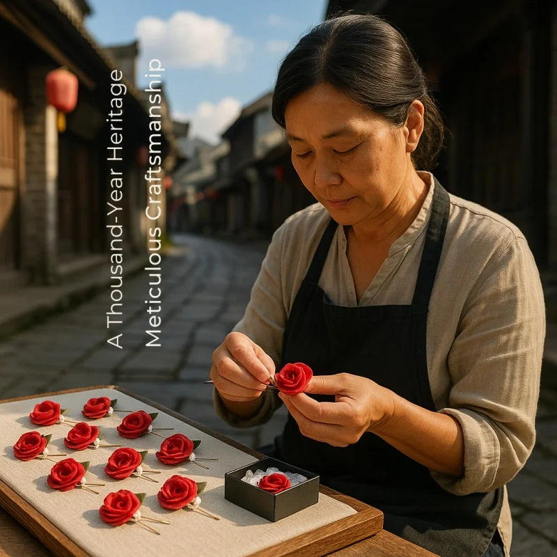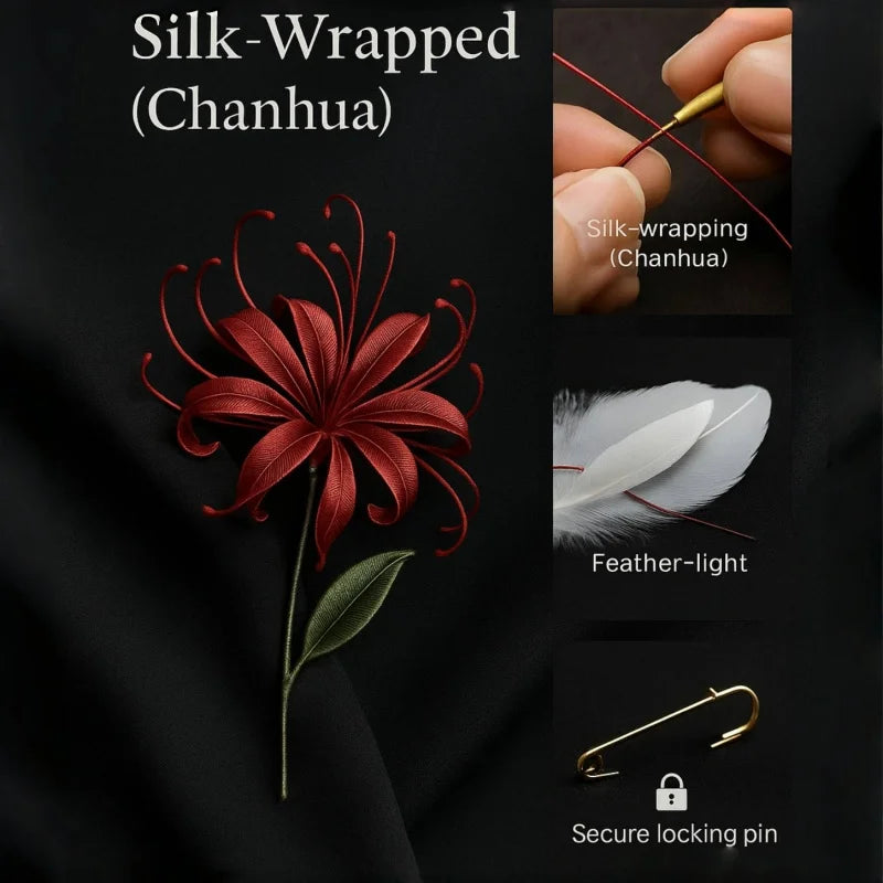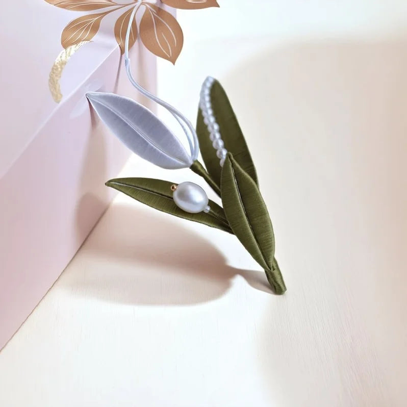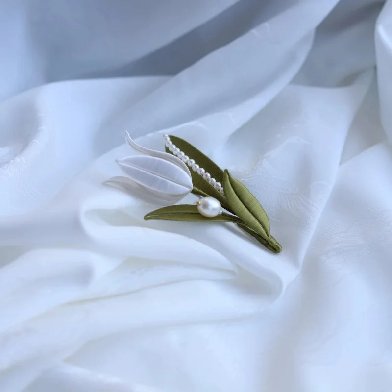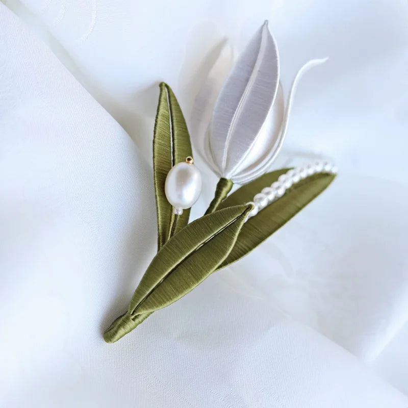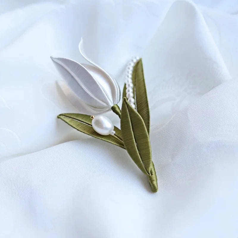 The White Tulip Silk-Wrapped Brooch is a delicate blend of traditional craftsmanship and modern aesthetics. Handmade using the centuries-old Chan Hua technique, each tulip petal is meticulously shaped from lustrous silk threads, giving it a natural, lifelike appearance. The pristine white petals symbolize purity and grace, while the soft green leaves add a refreshing contrast. Embellished with a string of fine pearls and a single statement pearl, this brooch exudes understated luxury.