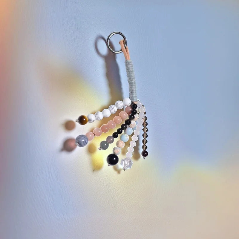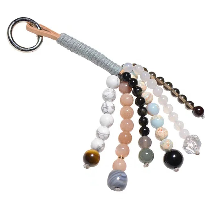 This handcrafted bag charm brings together nine types of natural gemstones, including Tiger’s Eye, Sunstone, Smoky Quartz, Clear Quartz, Goldstone, and more—each bead carefully selected for its natural color and symbolic meaning. Threaded onto strong cotton and cowhide cord, the strands form an elegant beaded tassel that sways softly with every step. Whether used as a keychain, a lucky charm, or a stylish accessory for your handbag, this piece radiates a serene and harmonious energy. With its minimalist knot work and multi-color palette, it adds a subtle statement of mindfulness, nature, and artisanal beauty. Total length is approximately 13cm, making it the perfect lightweight accent for everyday use or thoughtful gifting.